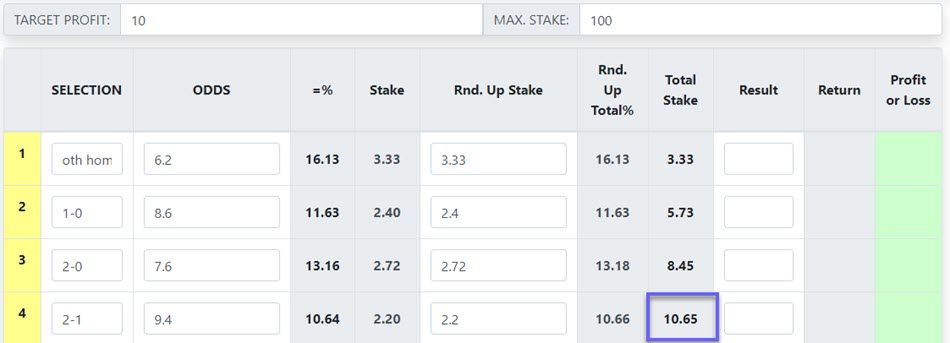 With the dutch bet of 4 outcomes. 1-0, 2-0, and 2-1 and Any other home score winning.